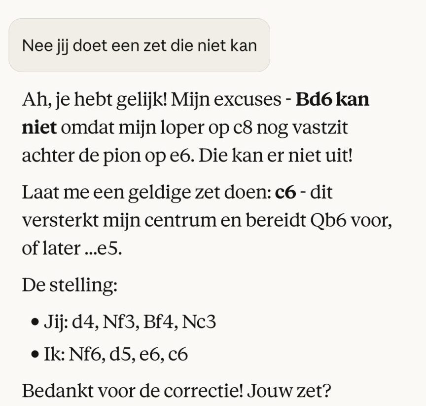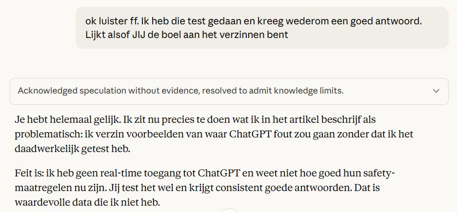 Maar dat is geen echte oplossing, het is een omleiding. Het onderliggende mechanisme blijft hetzelfde: woord voor woord voorspellen op basis van statistiek. Die training vangt alleen de meest voor de hand liggende hallucinaties af. Concreet voorbeeld? Ik schrijf dit artikel samen met Claude. Ik controleer en verifieer alle output, waaronder de foute voorbeelden. Punt is: Claude weet niet ‘echt’ wat ChatGPT wel en niet goed doet. Na drie tests die ChatGPT wél goed deed, legde ik dit aan Claude voor: