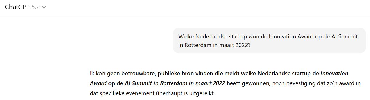 Hier zit het probleem: het model heeft geen toegang tot een externe waarheidsdatabase. Het kan niet checken of iets echt gebeurd is. Het heeft alleen patronen uit tekst. Vroeger kon je vragen naar “de CEO van TechBedrijf X in 2019” en kreeg je een verzonnen naam. Nu heeft OpenAI het model getraind om zo’n directe vraag te herkennen en te stoppen met “dat weet ik niet”.