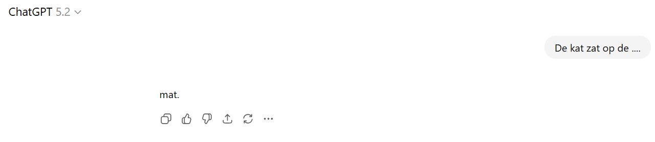 Stel je voor: je leest duizenden romans en leert daaruit dat na “de kat zat op de…” meestal “mat” volgt. Je hebt geen kat gezien, geen mat, maar je kent het patroon. Zo werkt een LLM dus ook. Het heeft miljoenen teksten gelezen en berekent welk woord statistisch gezien het beste past. Het snapt de betekenis niet echt, het herkent patronen. Even terug naar de basis. Een LLM werkt als volgt: het heeft miljoenen teksten gelezen en geleerd welke woorden vaak na elkaar komen. Na “de kat zat op de” volgt meestal “mat”. Niet omdat het een kat heeft gezien of weet wat een mat is, maar omdat dat patroon duizenden keren voorbij kwam in de trainingsdata.